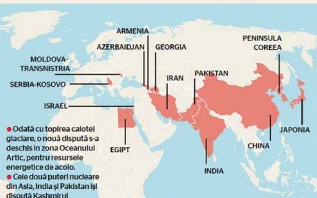 0Diferendele teritoriale din diferite colţuri ale lumii pot declanşa un război în care să fie atrase şi marile puteri. Disputele cu potenţialul cel mai exploziv sunt în Marea Chinei de Est, în Orientul Mijlociu, în Caucaz şi în Balcani.