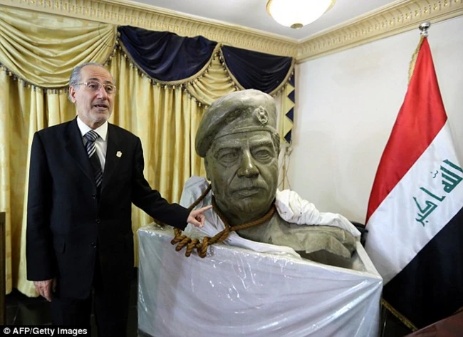 Al-Rubaie ţine frânghia în jurul unui bust de-al lui Saddam, pe care l-a căpătat tot după răsturnarea regimului condus de acesta.
