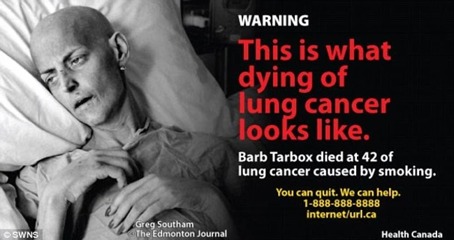 Una din imaginile şocante care vor fi puse pe pachetele de ţăgări o arată pe Barb Tarbox, o femeie bolnavă de cancer care îşi trăieşte ultimele clipe. Femeia este întinsă în pat şi este vizibil că este foarte slăbită. Fotografia va fi însoţită de mesajul: " Aşa arată oamenii care mor de cancer de plămâni".