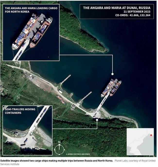 Imaginile din satelit analizate de RUSI arată că cele două nave, numite Angara și Maria, sunt încărcate în portul Rajin din Coreea de Nord și descărcate la baza militară Dunai din Rusia. Cel puțin cinci călătorii între cele două porturi au fost observate în august, potrivit RUSI.