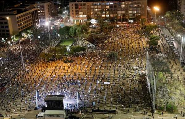 Aproximativ 1.500 de persoane s-au adunat în Piaţa Rabin din centrul oraşului respectând regulile de distanţare socială, potrivit unui corespondent al agenţiei France Presse aflat la Tel Aviv.