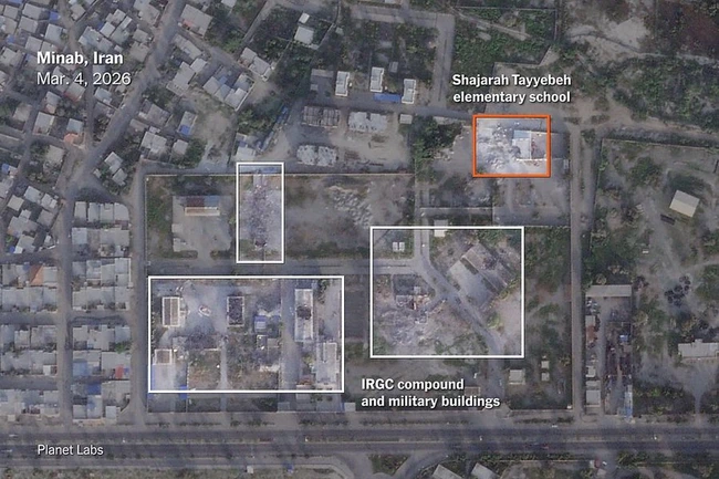 Imaginile din satelit arată că școala este adiacentă complexului fortificat Seyyed Al-Shohada al Gardienilor Revoluției. Cel puțin alte cinci clădiri din cadrul complexului au fost afectate, fiind vizibile cratere, acoperișuri arse și dărâmături. Hărțile arată că un spațiu de locuit al Brigăzilor Assef, parte a forțelor navale ale Gărzii, se află la doar 150 de metri de școală, în apropierea Strâmtorii Ormuz.