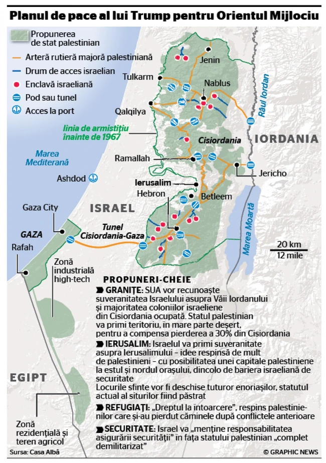 În schimb, palestinienii ar primi Gaza, părţi din Cisiordania şi anumite cartiere de la marginea Ierusalimului, toate legate de o reţea nouă de drumuri, poduri şi tuneluri. Israel ar controla graniţele şi spaţiul aerian.