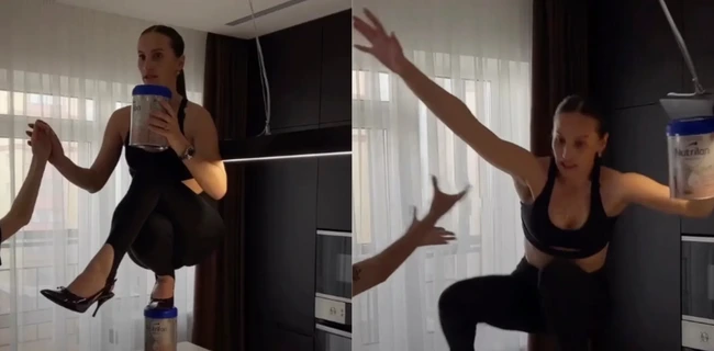 Ce presupunea această provocare? Să te urci pe un borcan cu mâncare pentru bebeluși așezat pe o cratiță întoarsă, purtând tocuri înalte, și să încerci să adopți o poziție complicată inspirată din videoclipul piesei „High School” al lui Nicki Minaj. Rezultatul? Mariana a căzut direct pe spate, pe podeaua din bucătărie, iar imaginile au devenit virale pe rețelele sociale din Rusia.