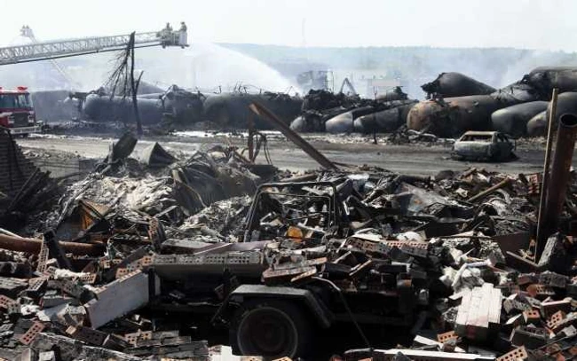Un tren fără mecanic şi având 72 de vagoane-cisternă încărcate cu 100 de tone de petrol fiecare, a deraiat sâmbătă, 6 iulie, în orăşelul turistic Lac-Mégantic (250 de kilometri est de Montreal), provocând o explozie gigantică ce a devastat centrul oraşului, distrugând aproximativ 30 de clădiri.