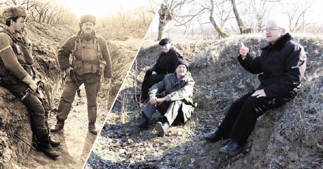 FOTO: Fraţii Alexandru şi Anatolie Croitor (primii din dreapta) deapănă amintirile în aceleaşi tranşee în care au luptat/ TUDOR IOVU