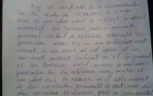 „Nu am dorit să mă apere acest avocat şi nici nu am avut un contract încheiat cu el. Am fost indus în eroare precum că ar fi un avocat de la Asistenţa Garantată de Stat, care va sta cu mine temporar, până vine apărătorul pe care l-am solicitat. Rog să-mi spuneţi cine l-a chemat, încălcându-mi dreptul la apărare“, se arată în cererea lui Nicolae Vicol, acuzat de acte de corupţie şi de faptul că ar fi pus la cale interceptări ale convorbirilor telefonice.