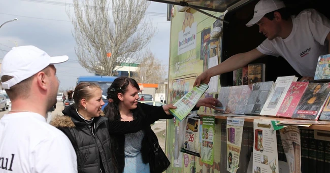 La punctul mobil de vânzare de lângă piaţa agricolă din oraş s-au adunat oameni din tot raionul care veniseră pentru cumpărături de Paşte. Unii, în loc de produse alimentare, au plecat acasă cu cărţi. Pe femeile care cumpărau foarte multe cărţi vânzătorii le ajutau să le ducă până la uşa apartamentului.
