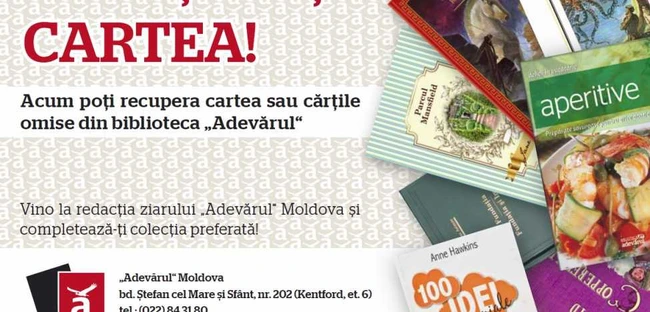 Vrei să-ţi recuperezi cărţile omise din biblioteca „Adevărul"? O poţi face la redacţia ziarului nostru din clădirea Kentford, pe Bd. Ştefan cel Mare şi Sfânt 202 la etajul 6, de luni până vineri, între orele13.00 şi 16.00 şi cumpără-le direct de la noi.