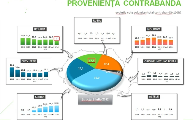 Contrabanda cu produse din tutun moldoveneşti în România este în continuă scădere. Astfel dacă în anul 2011, Republica Moldova era principalul furnizor de ţigări de contrabandă pe piaţa românească deţinând o cotă de 34,1%, apoi la începutul anului 2012 această a coborât la 25,5%, iar în iulie la 22,4%. În prezent principalele surse de contrabandă în România a ţigărilor a ajuns Serbia cu 32% şi magazinele duty free cu 23,2%.