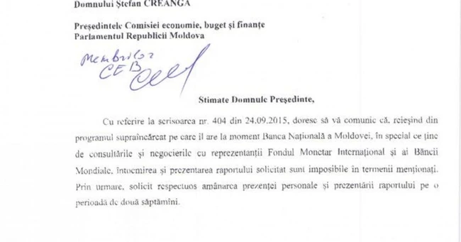 Dorin Drăguţanu a adresat ieri un demers preşedintelui Comisiei parlamentare economie, buget şi finanţe, Ştefan Creangă, prin care a cerut amânarea prezentării raportului din cauza lipsei de timp. Guvernatorul BNM a motivat solicitarea de a amâna participarea sa la audieri în cadrul şedinţei Comisiei prin faptul că are un „program supraîncărcat în special ce ţine de consultările şi negocierile cu Fondul Monetar Internaţional şi Banca Mondială”.
