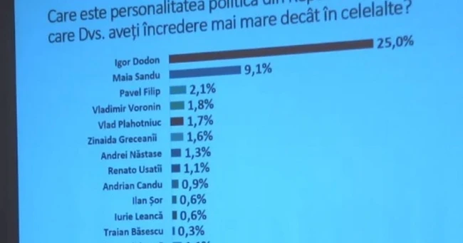 În premieră, în datele studiului apare şi numele fostului preşedinte al României Traian Băsescu, însă oficialul român are doar 0,3% din încrederea moldovenilor.