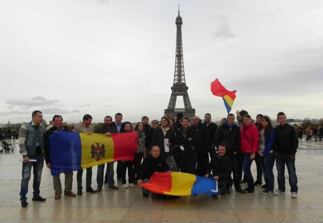 Circa 20 de tineri s-au adunat cu steaguri tricolore la turnul Eiffel din Paris la un flashmob cu genericul „Moldova va fi europeană“.