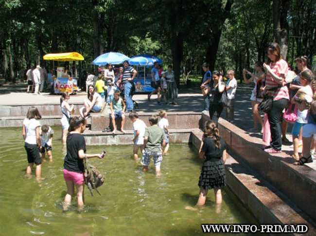 „E cald şi vrem să ne răcorim un pic. Am venit în excursie la Chişinău şi vrem să ne ducem de aici cu amintiri frumoase. Nu ştiu dacă ni se permite să intrăm în havuz, dar am văzut mai mulţi copii, de aceea am intrat şi noi", spune Adrian Mocanu, din Cantemir, însoţit de mai mulţi colegi.