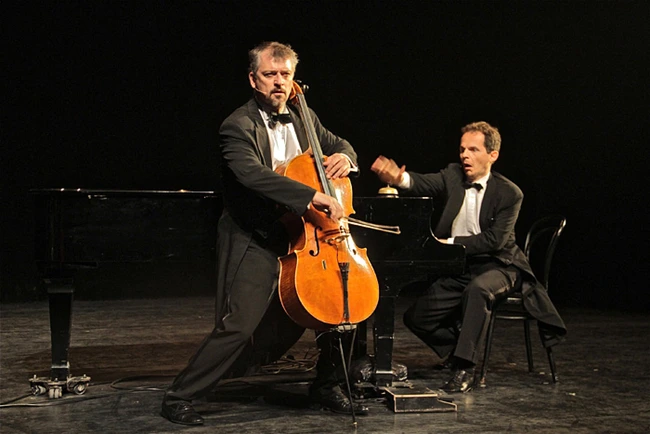 0Laurent Cirade cântă la violoncel, interpretează doine la arcuş şi face show din muzica la fierăstrău, în spectacolul instrumental extravagant – un adevarat duel dintre comedie şi muzică - prezentat, împreună cu pianistul român Paul Staicu, în cadrul Bienalei Teatrului „Eugene Ionesco“.