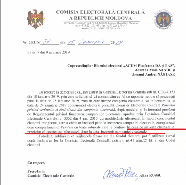 Ea susţine că Blocul ACUM a fost înregistrat în calitate de concurent electoral pe 2 ianuarie, prin urmare anume din această zi ACUM ar avea dreptul legal să facă încasări şi cheltuieli din contul „Fondului electoral”.
