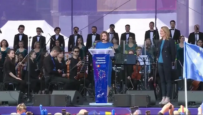 ,,Am venit să spunem răspicat, cu încredere și cu mândrie. Moldovenii sunt europeni. Locul Moldovei este în Uniunea Europeană. Proiectul nostru de țară și obiectivul nostru este ca Moldova să fie până în 2030, membru cu drepturi depline al familiei europene. Acesta nu este doar angajamentul meu, avem susținerea Uniunii Europene în acest drum și asta o cere poporul Republicii Moldova, a cerut-o de fiecare dată când a ieșit în stradă să-și apere drepturile. A cerut-o la alegeri, o cere acum când iarăși ne-am adunat împreună pentru a decide soarta Moldovei. Europa este mai mult decât o lozincă politică, Europa este un mod de viață, este un vis care trebuie să devină realitate și este șansa poporului nostru să trăiască în pace, în liniște și în belșug”, a declarat Maia Sandu de la tribuna din centrul Chișinăului, fiind alături de Roberta Metsola, președinta Parlamentului European care a venit în țara vecină pentru acest eveniment.