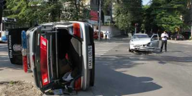 Mașină a poliției, răsturnată în urma unui accident în centrul Chișinăului