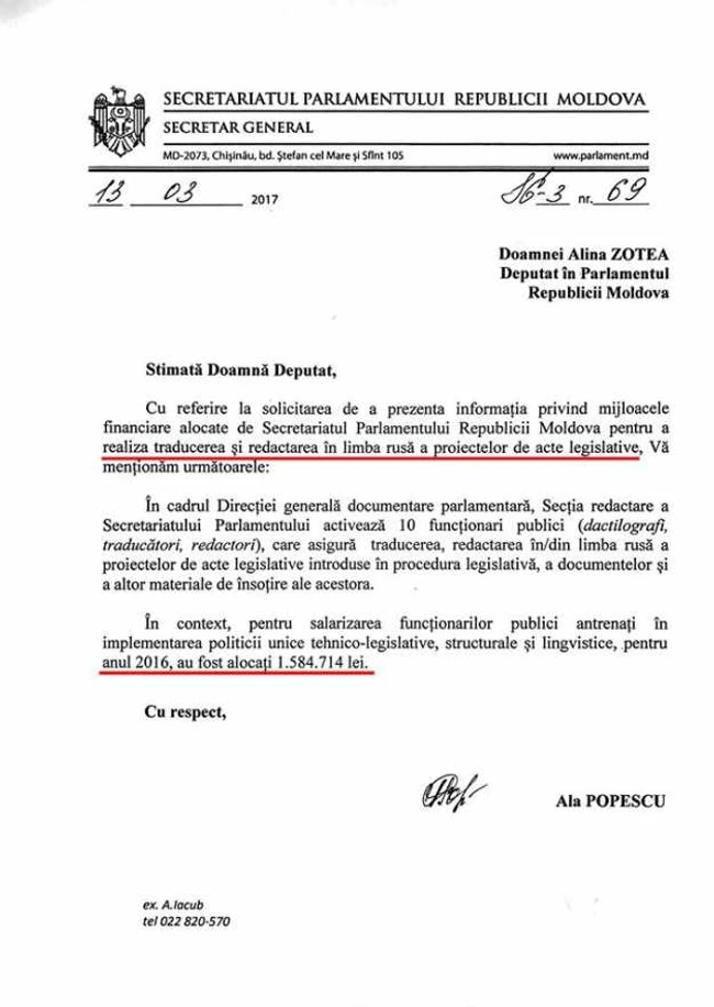 „Cea mai săracă ţară din Europa cheltuie 1.584.714 lei pentru traducerea, redactarea în/din limba rusă a proiectelor de acte legislative introduse în procedura legislativă în Parlamentul Republicii Moldova. Asta în situaţia în care în Republica Moldova avem şcoli, grădiniţe nereparate şi spitale care nu corespund necesităţilor pacienţilor, iar nivelul de trai al unei bune părţi a populaţiei este sub minimul de existenţă”, a scris Zotea pe pagina sa de Facebook.