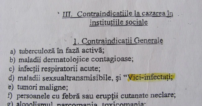 Conducerea azilului de bătrâni a invocat un regulament din anul 2000, emis de Ministerul Muncii şi Protecţiei Sociale, care spune că cei infectaţi cu HIV au „contraindicaţie la cazarea în instituţiile sociale".