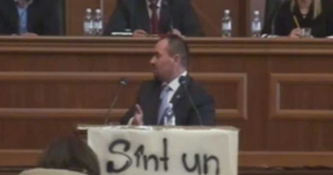 0Nemulţumiţi de raportului procurorului general, comuniştii Grigore Grigore Petrenco şi Grigore Poleanschi au lipit pe tribuna de la care vorbea Valeriu Zubco, o pancartă de la care dădea răspunsuri de la întrebările deputaţilor. „Sunt un mincinos", scria pe pancarta lipită pe tribună.