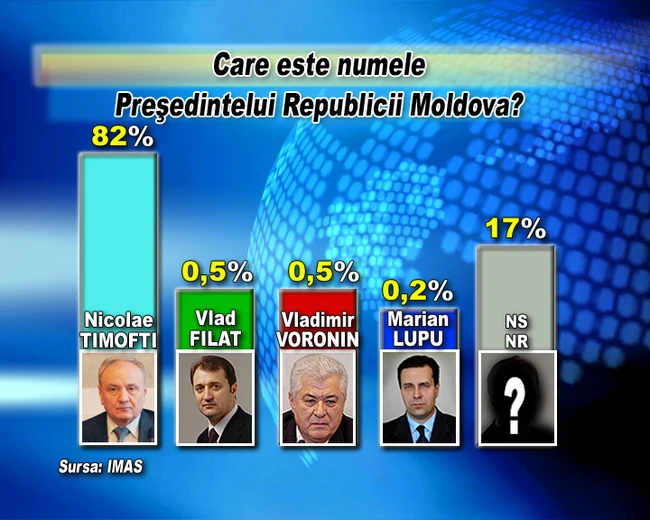 Astfel, 82 la sută din respondenţi ştiu că preşedintele ţării este Nicolae Timofti, 0,5% cred că Vlad Filat sau Vladimir Voronin este şeful statului, iar 0,2 îl consideră pe Marian Lupu preşedintele ţării. 17 la sută din intervievaţi nu ştiu cine ocupă această funcţie, potrivit inprofunzime.md.