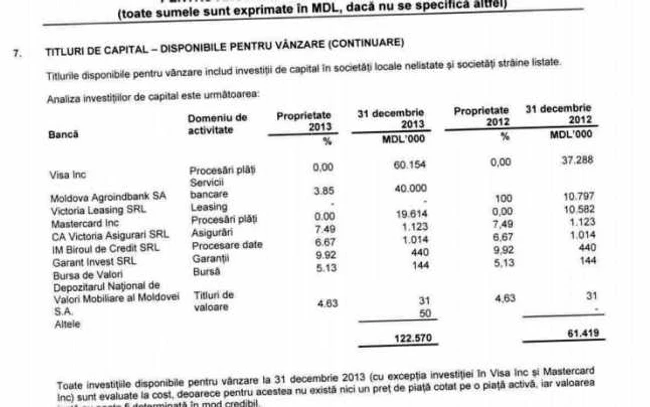 Raportul anual al Victoriabank relevă că banca deţine acţiuni la corporaţiile internaţionale Visa Inc. şi Mastercard Inc.,dar şi la compania autohtonă Victoria Asigurari.