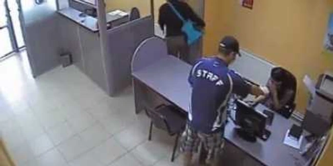 În secvenţe se vede cum doi bărbaţi care poartă chipiuri pe cap, măşti şi mănuşi medicale dau buzna în sediul băncii. Ei ameninţă angajaţii şi iau banii din safeul schimbului valutar. Operaţiunea durează mai puţin de două minute.