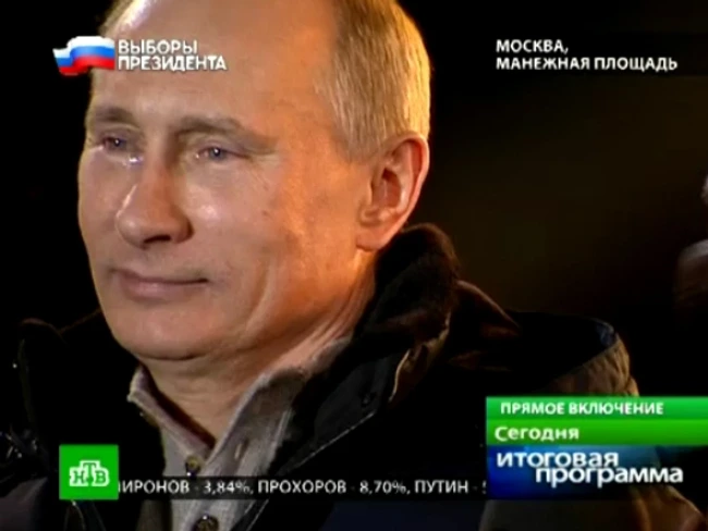 0Premierul rus Vladimir Putin, care potrivit rezultatelor parțiale a câștigat alegerile prezidențiale, a ieșit în fața susținătorilor săi adunați în piața Manejnaia de la Moscova pentru a-și anunța victoria. Pe obrajii viitorului președinte curgeau șiroaie de lacrimi.