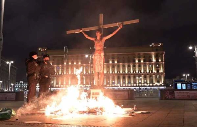 VIDEO Scene impresionante la Moscova. Un tânăr s-a răstignit în semn de protest în faţa sediului FSB
