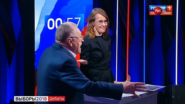 Totul a început în timpul în care evolua Serghei Baburin, un alt candidat la prezidenţialele din 18 martie curent. Jirinovski a intervenit peste timpul alocat lui Baburin, iar Sobciak l-a îndemnat pe acesta la calm. Astfel, liderul PLDR a numit-o „proastă” pe fosta moderatoare TV.