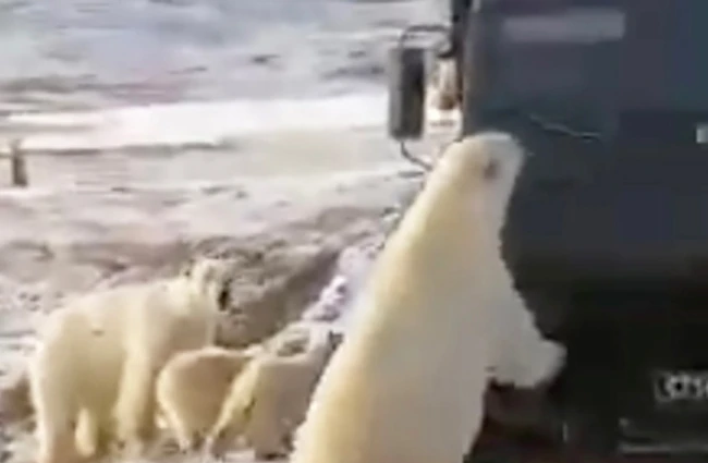Zece urşi polari - şase adulţi şi patru pui - au luat cu asalt un camion care transporta gunoi, scrie The Siberian Times, publicând un filmuleţ cu acest moment.