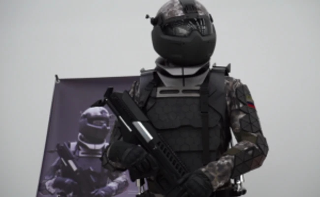 Costumul, cu protecţie sporită, dispune de o cască ce acoperă complet faţa soldatului şi un exoschelet care îmbunătăţeşte performanţa şi rezistenţa în timpul luptei.