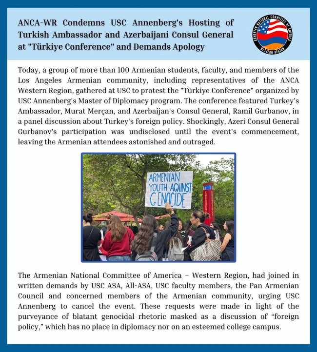 „Oficialii noștri care au participat la conferința privind diplomația publică turcă, organizată de Școala Annenberg de Comunicare și Jurnalism a Universității din California de Sud și Institutul Yunus Emre, pe 29 septembrie 2023, au fost supuși atacurilor verbale și fizice și hărțuirii de către grupări armene radicale”, a raportat ministerul de externe turc pe site-ul propriu.
