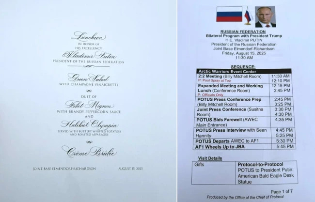 Prima pagină a pachetului tipărit dezvăluia secvența întâlnirilor pentru 15 august, inclusiv numele exacte ale sălilor din baza militară unde urmau să aibă loc, și indica intenția lui Trump de a-i oferi lui Putin un cadou ceremonial.