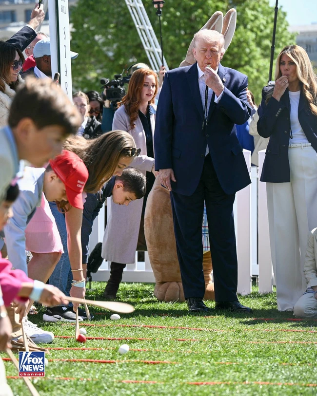 Familia Trump s-a îndreptat apoi spre jocul clasic Egg Roll, fluierând pentru a da startul competiției.