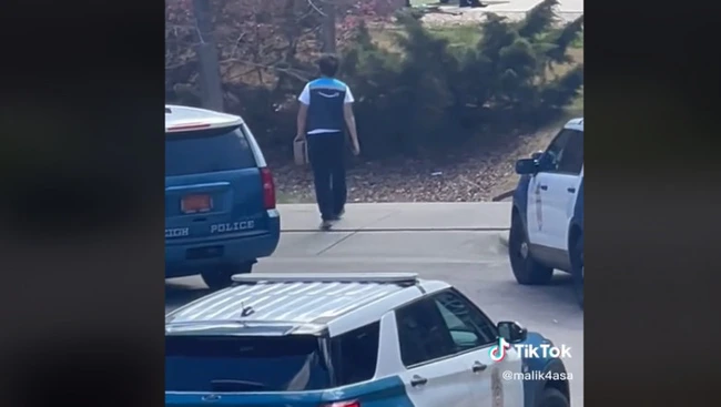 În înregistrarea video, postată pe pe TikTok pe 18 martie, se vede cum curierul duce o cutie mică până la aleea unde aparent are loc confruntarea, luându-i prin surprindere pe ofițeri. Imediat ce îl văd, aceștia îi spun să se oprească și îi iau pachetul din mâini, iar după acesta se întoarce calm la mașina sa și face o fotografie rapidă a scenei.