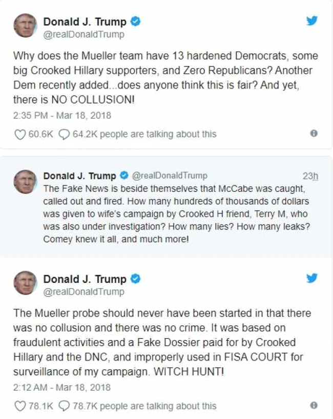 La două zile după concedierea fostului număr doi în FBI Andrew McCabe, pe care-l avea în colimator de mai multe luni, preşedintele american a lansat o nouă salvă de tweet-uri răzbunătoare, subliniind că este victima unei ”vânători de vrăjitoare”.