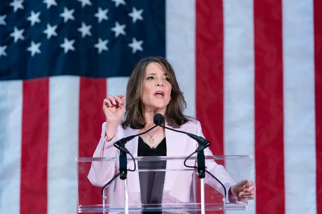 Într-un discurs foarte la stânga ţinut în faţa partizanilor săi reuniţi la Washington, Marianne Williamson nu l-a citat pe Joe Biden, dar a denunţat un sistem politic „rezistent la schimbare", „corupt" de marile companii.