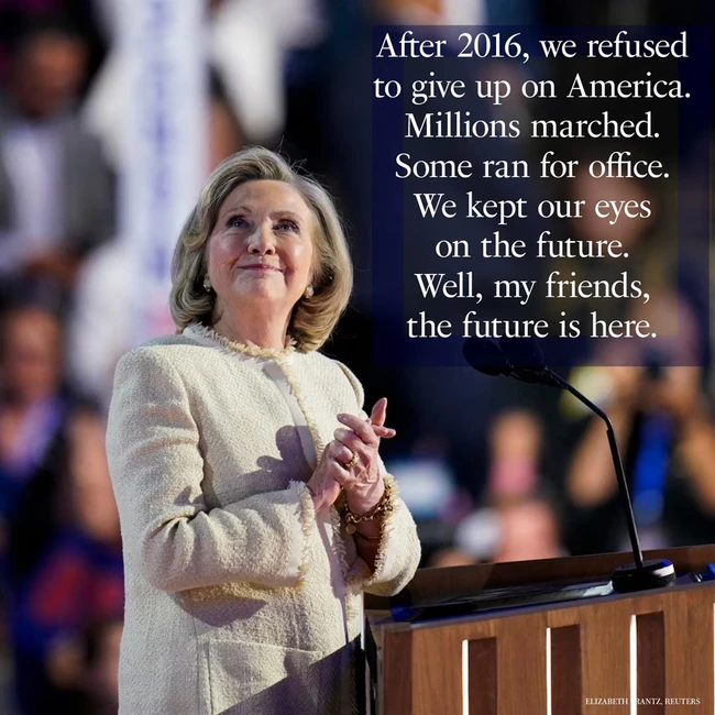 Fosta Primă Doamnă a menţionat apoi candidatura sa eşuată la prezidenţiale în 2016, când a câştigat votul popular, dar a pierdut în cele din urmă în faţa lui Donald Trump.