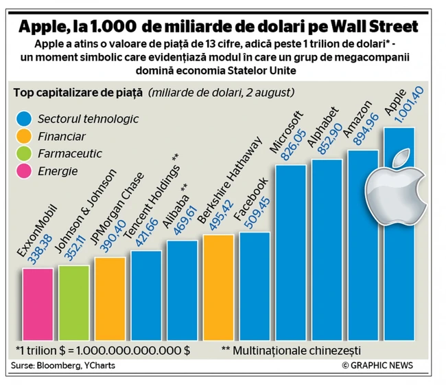 Performanţa Apple de a atinge valoarea de peste 1.000 de militarde de dolari reflectă ascensiunea megacompaniilor puternice, reprezentând un moment crucial pentru sistemul capitalist, comentează New York Times, avertizând însă că amplificarea profiturilor poate genera dezechilibre sociale.