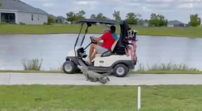 Chiar în acel moment, un cărucior de golf trece pe lângă potecă, dar aligatorul își menține ritmul lent în timp ce continuă să meargă. Nu la fel stau lucrurile când se apropie un al doilea cărucior de golf, iar aligatorul accelerează și se grăbește înspre vehicul.