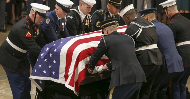 Actualul lider al Casei Albe i-a adus un omagiu luni seara predecesorului său, chiar dacă acesta din urmă a afirmat că nu a votat pentru el la alegerile din 2016. În tăcere, Trump şi soţia sa au intrat în rotonda Capitoliului, iar în faţa sicriului preşedintele american a executat un salut militar.