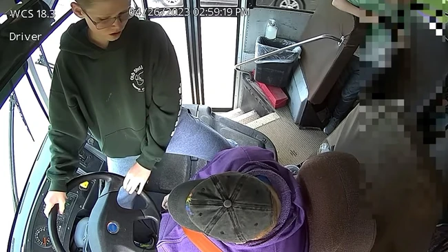 Elevul de clasa a VII-a a reușit în cele din urmă să oprească autobuzul fără incidente înainte ca doi trecători să intervină pentru a-i ajuta pe elevi să coboare din autobuz.