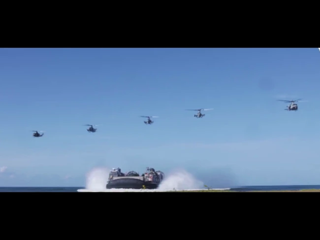 Filmele arată un LCAC - un aeroglisor de mari dimensiuni care transportă trupe, vehicule şi echipamente - efectuând o debarcare cu sprijinul mai multor unităţi de elicoptere de transport UH-1Y, de la bordul cărora pușcașii marini au exersat şi debarcări, şi al unor elicoptere de atac Apache.