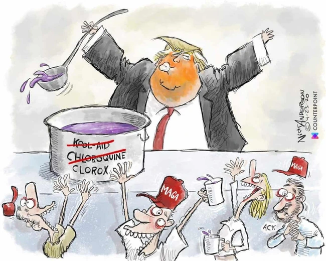 Intitulată „Cultul lui Trump”, cacricatura îl prezintă pe actualulul lider de la Casa Albă scoţând cu polonicul un lichid purpuriu dintr-un vas etichetat „Clorox” şi împărţindu-l unor adepţi de-ai săi purtând pălării roşii inscripţionate „MAGA”. Alte două cuvinte - „Kool-aid” şi „Chloroquine” - apar tăiate.