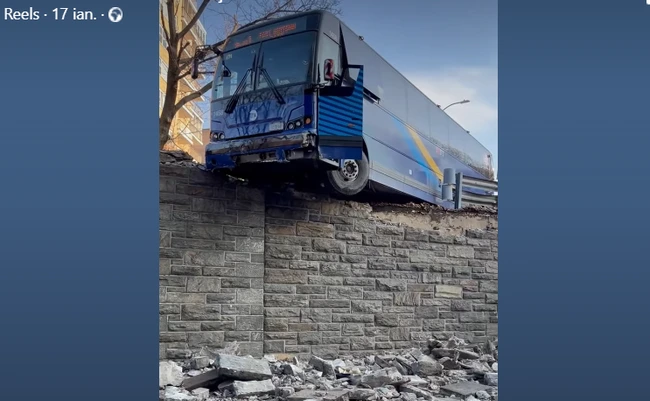 Video Un autobuz a rămas suspendat la o înălțime de aproape patru metri, după ce a lovit un parapet