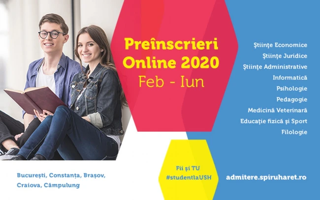Universitatea Spiru Haret desfăşoară până la data de 30 iunie campania de preînscrieri online la cele 42 programe de Licenţă şi 31 programe de Masterat în cele cinci centre universitare din Bucureşti, Constanţa, Braşov, Câmpulung şi Craiova. Candidaţii care se preînscriu on-line pe site-ul www.admitere.spiruharet.ro vor fi scutiţi de plata taxei de admitere.