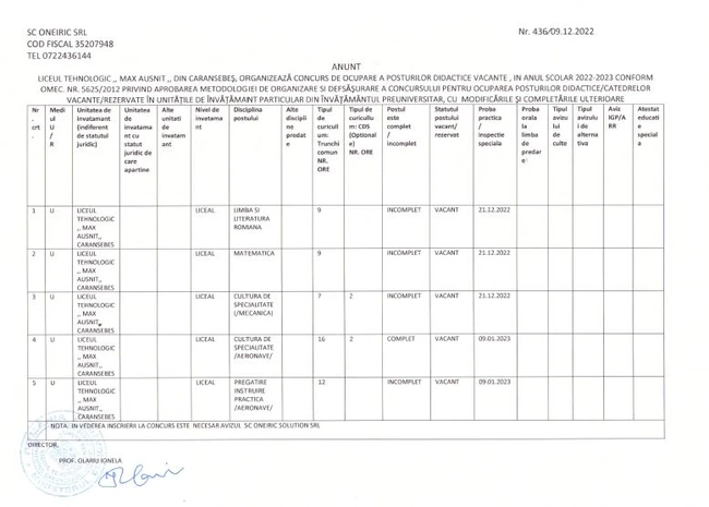 0Liceul Tehnologic „Max Ausnit“ din Caransebeș, organizează concurs de ocupare a pos-turilor didactice vacante, în anul școlar 2022-2023 conform OMEC nr. 5625/2012 privind aprobarea metodologiei de organizare și desfășurare a concursului pentru ocuparea posturilor didactice/ catedrelor vacant/ rezervate în unitățile de învățământ particular din învățământul preuniversitar, cu modificările și completările ulterioare.