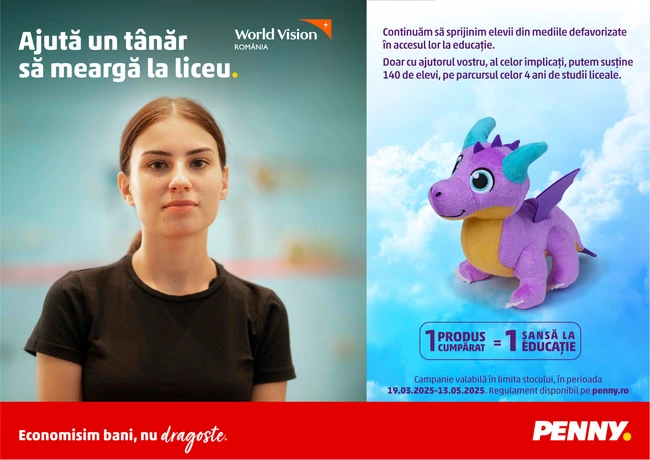 În cadrul acestei campanii, PENNY continuă parteneriatul cu World Vision România, susținând programul „Vreau în clasa a 9-a”. Prin acest demers, 140 de elevi din județele Vaslui, Brăila, Cluj, Bistrița-Năsăud, Iași, Vâlcea, Buzău, Bacău, Dolj și Ilfov beneficiază de sprijin concret pentru a-și continua studiile liceale pe parcursul a patru ani.